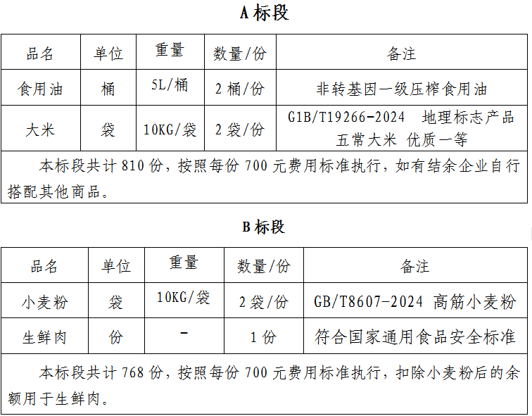 2.项目内容:食用油、大米、生鲜肉、小麦粉等。本项目划分为3个标段,A标段:食用油和大米等,按照人均700元费用标准执行;B标段:小麦粉和生鲜肉,按照人均700元费用标准执行;C标段:食用油、大米、小麦粉、生鲜肉,按照人均850元费用标准执行。三个标段的具体情况如下: