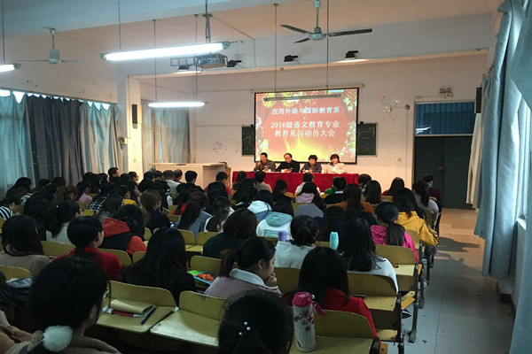 为突出高职师范类专业人才培养特色,加强实践性教学环节,增加专业感性知识和教育行业认知,初步了解小学基本的班级管理、课堂教学组织环节与技巧, 11月15日,应用外语与国际教育系召开2016级语文教育专业教育类专业学生教育见习动员会。系主任张彦鸽,党总支书记田玉枝,副主任孟令超、吕红梅,语文教育教研室、小学教育教研室全体教师以及即将参加教育见习的2016级语文教育专业287名同学参加。