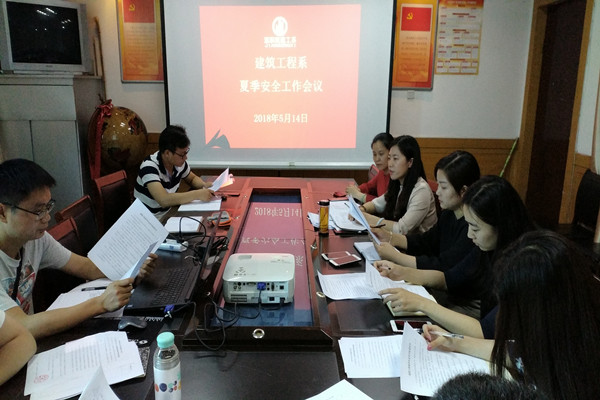 为切实加强学生的安全管理工作,进一步落实“安全第一、预防为主”的方针,保护学生的人身安全, 维护系部正常的教育教学秩序,5月14日下午,建筑工程系召开2018夏季学生安全工作专题会议。系主任赵冬梅,副主任李文静,团总支书记王志皓及全体辅导员参加。