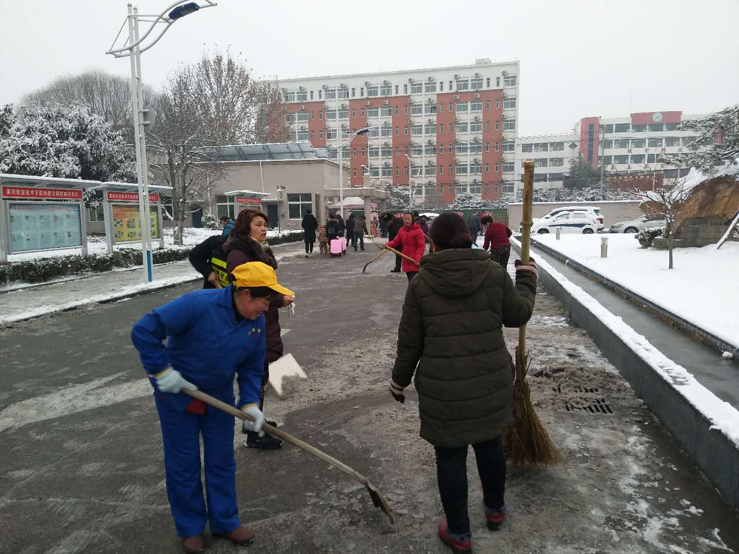 1月10日,漯河降下大雪,校园到处银装素裹,给师生带来惊喜的同时,也为出行带来不便。为保证大家安全出行,总务处提前发放清雪工具,早上五点开始安排部门全体同志以及物业、保洁人员清扫校内道路积雪,同时协调市环卫处扫雪车进行机械除雪,确保老师、同学们上班、上课行走安全。看到忙碌除雪的身影,过往的老师、同学们纷纷竖起点赞的大拇指。