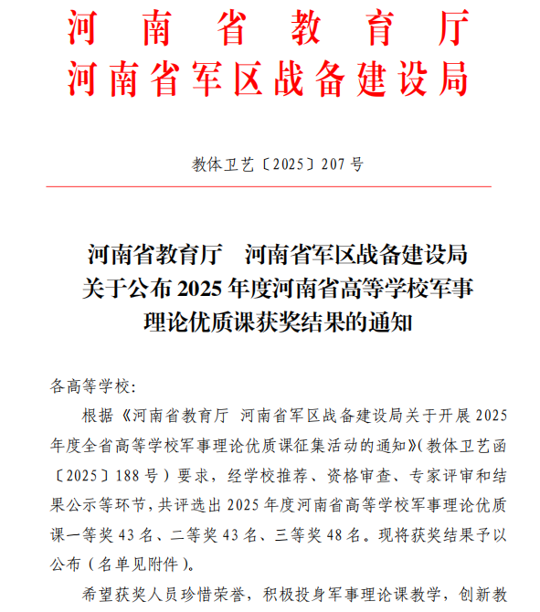 近日,河南省教育厅、河南省军区战备建设局发布《关于公布 2025年度河南省高等学校军事理论优质课获奖结果的通知》。我校教师杨文杰讲授的《信息化战争》课程荣获省级三等奖。