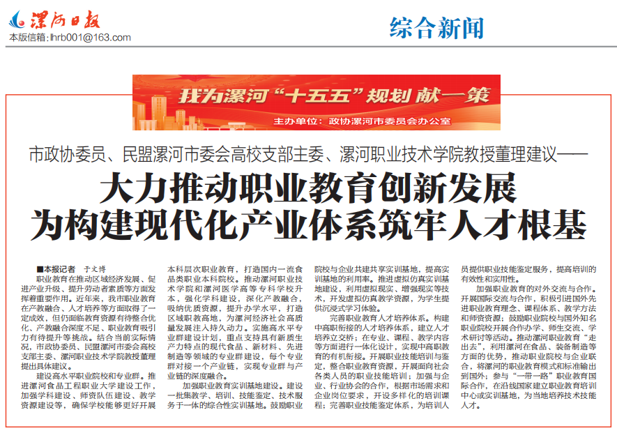 近日,我校董理教授撰写的关于职业教育创新发展的政策建议文章,在《漯河日报》综合新闻版显著位置全文刊登,引发社会各界广泛关注与好评。