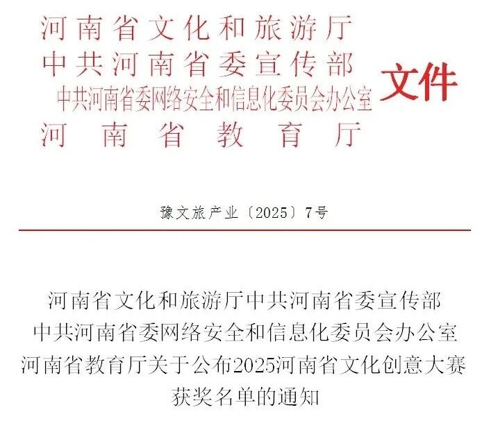 近日,由河南省文化和旅游厅、中共河南省委宣传部、中共河南省委网络安全和信息化委员会办公室、河南省教育厅联合主办的2025河南省文化创意大赛圆满落幕。我校师生凭借对本土文化的深度理解与创新表达,在比赛中表现优异,共斩获五项大奖,包括银奖3项、铜奖2项,充分展现了学校在文化育人方面的扎实成效。
